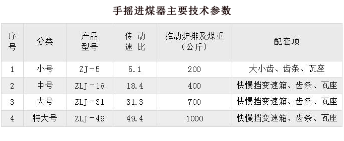 ZLJ型系列手搖進(jìn)煤器分為中號(hào)、大號(hào)與特大號(hào),均由變速箱和交錯(cuò)孔瓦座及推煤齒條等組成。新產(chǎn)品可分快慢擋,正常推煤時(shí)(撥出)使用慢擋;回程時(shí)手柄壓入使用快擋,可極大降低司爐強(qiáng)度,提高工效;ZJ型為小號(hào)進(jìn)煤器,其結(jié)構(gòu)為齒輪與齒條集成布置于交錯(cuò)型瓦座一體上,無變速箱。安裝時(shí)可安于推煤平臺(tái)下方或上方,根據(jù)爐膛寬度自配聯(lián)接短管。